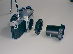 Prime focus photography consists of attaching the camera to the telescope utilizing the telescope as a giant lens. The camera is attached to the telescope with a T-ring (to fit your specific camera)and a T-ring adapter (see image). This type of configuration requires guiding the telescope either manually using the hand controls or with an electronic guider for longer deep space exposures, however, it is possible to do lunar and planetary photography with little or no guiding.