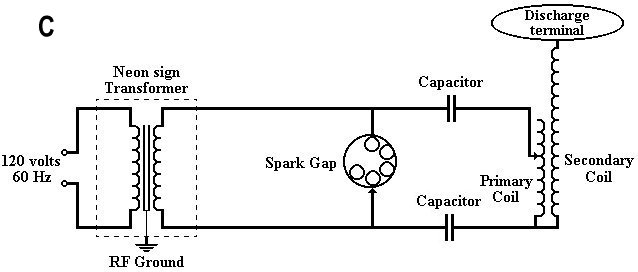 Basic Tesla coil theory involves the property of resonance. When a coil and capacitance are connected in parallel and briefly pulsed with a voltage, the discharge flows back and forth between the two at a frequency that depends on the values of both, until disipated by the resistance of the two. Change the value of either one and the resonant frequency changes. In a Tesla coil, there are actually two resonant circuits connected together. One, between the capacitor and the primary, the other between the secondary and the same capacitor. The voltage is injected by the Neon Sign Transformer, alternating at 60 Hz, (cycles per second). As the potential across the gap increases, the charge across the capacitor also increases. When the gap breaks down, meaning the charge across it is sufficient for electrons to jump across, it sparks and causes the capacitor to discharge through the primary. This discharge then resonates back and forth through the primary and to alternate plates of the capacitor until the charge across the gap builds up again. Since the secondary is also connected to the capacitor, the secondary also resonates. When the frequency of the capacitor and primary circuit resonates at the same frequency as the capacitor and the secondary, the voltages add, and the output goes up through the roof. The frequencies involved are in the hundreds of thousands of Hz, and the voltages can reach into the hundred thousands or even millions of volts.