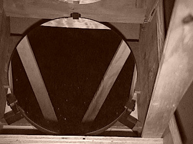 Figure 4 shows a view inside the mirror box. You can see the clamps on the inside corners, and the collimation mark at the center of the mirror.