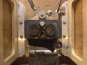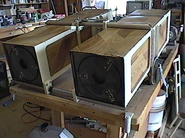 The chair consists of four basic structures. The base, the azimuth box, the chair section and the optical tube assembly. This page will describe the optical tube assemblies, (OTA) and subsequent pages will describe the other major parts. Hopefully, this arrangement will cut down on the load times for all the pictures I'll need to include. The OTA consists of two, 8" F/4 telescopes mounted such that the light beams come to focus between the two separate tubes. They are rectangular boxes made of plywood and hardboard and are held stable relative to each other with 1" aluminum tubing at three strategic points-one above at the center and two below on either end. At the center of mass of both units is mounted an altitude bearing that allows the unit to be rotated upward, allowing the user entrance to the chair. The OTA is then lowered such that the user's eyes can access the eyepiece/focuser unit mounted between the two tubes.