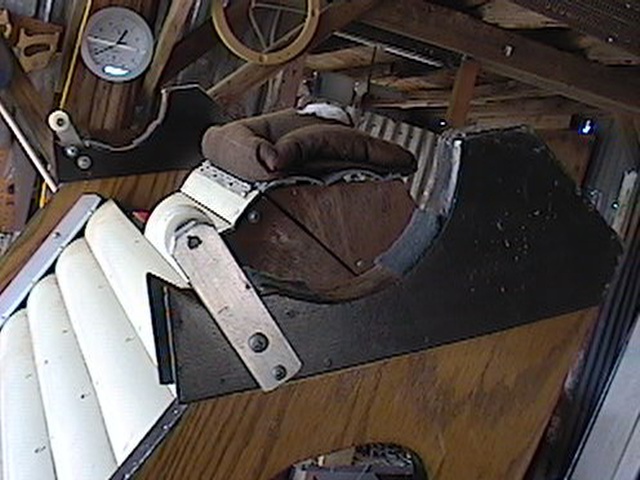 Pierre has left us, but his legacy lives on in his myriad optical creations. This page will chronical the rebuilding of one of them-his motorized, 8" F/4 binocular chair. I happened onto it during one of the first SAC ATM meetings. A lot of Pierre's equipment and supplies were left behind. Some were brought to the metting for input on what to do with it. Someone was suggesting we split the optical tube assemblies into two 8" F/4 Dobs to be used as club scopes for newbies. I found this idea abhorent, so I volunteered to take it all home, evaluate its disposition and refurbish it if possible. I had a plan to install it in the rolloff roof of my Stone Haven Observatory, for use by visitors to star parties I regularly give. It's only been recently I've been able to find the time to look into the restoration. I believe I'll have most of the materials I need on hand, but some restoration of the building is now in order. More on that later. In the mean time, I'll take pictures of the chair in its present state and as it gets fixed. I'll also be entering the plans into a CAD program to document all dimensions and so on. I hope you're sitting comfortably...
