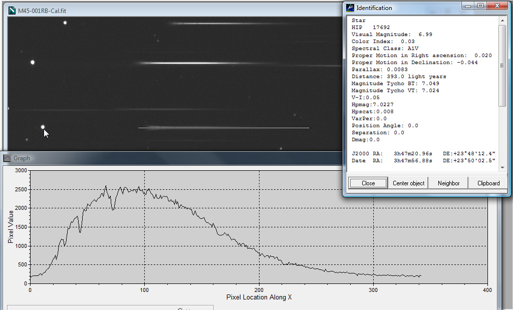 - A MaxIm DL V5.07 measurement line is placed on spectral order of plus one and the pixel values are shown in the graph window. The pixel locations along X axis represents the wavelength of the star light. In the graph the short wavelengths are on the left and the long wavelengths are on the right.