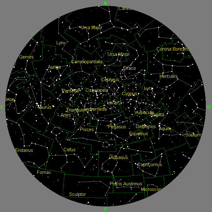 On the above all sky map click on an area to view a detailed unaided eye constellation map of that area.