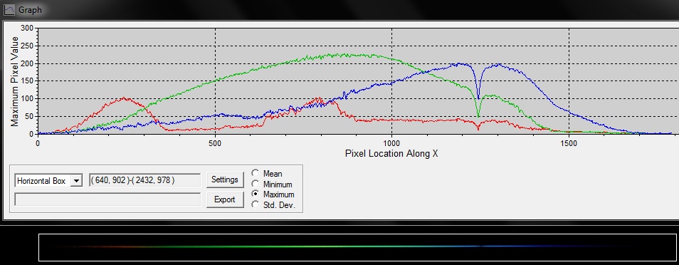 - 7998 img 1/20 sec. exposure = spectrum very small, blue is almost invisible, orange almost completetely overshadowed by red, red is also much smaller